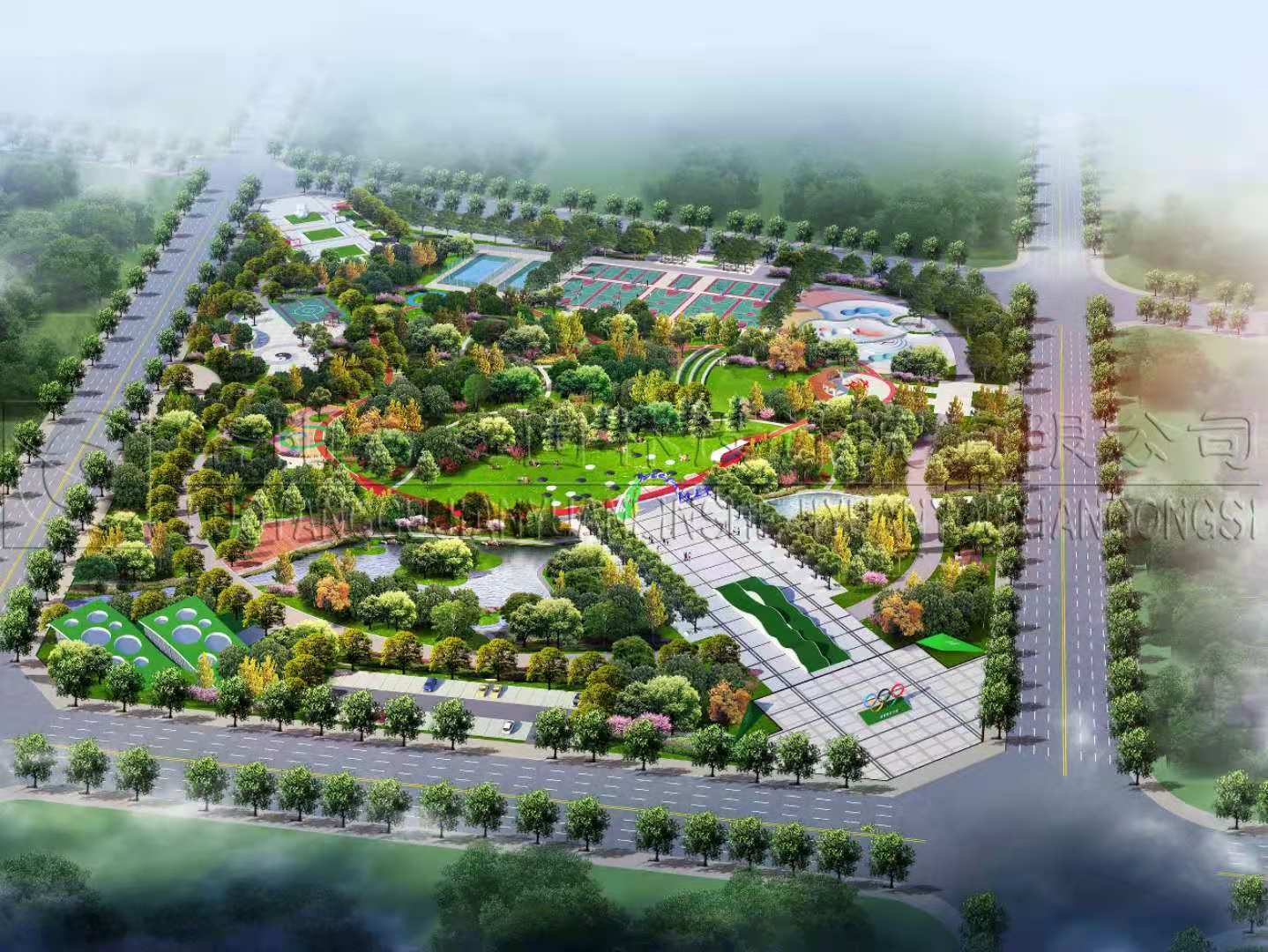 設(shè)計(jì)依托城市規(guī)劃的總體定位,“以健身運(yùn)動(dòng)為主,集體育、健身、休閑、娛樂為一體的開放性公園綠地”以足球、籃球、羽毛球、網(wǎng)球、排球、門球、健身路徑等露天戶外運(yùn)動(dòng)項(xiàng)目為主。